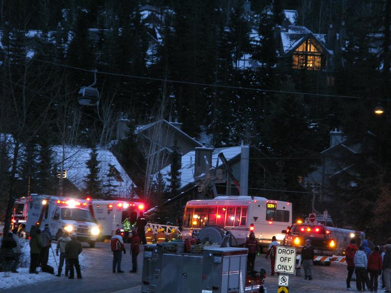 そしてブラッコム山からウィスラー山へ移動し、下へ降りてみると消防車、警察、ヤジ馬たちでビレッジが騒然。